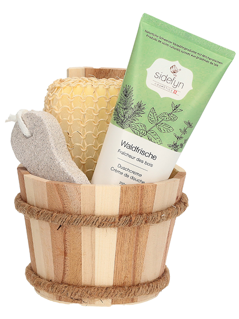 Offrez un moment de bien-être : ce coffret Sidefyn associe la crème de douche appréciée de la gamme à une pierre ponce de qualité et à une éponge de douche douce – le tout présenté dans un élégant petit baquet en bois.